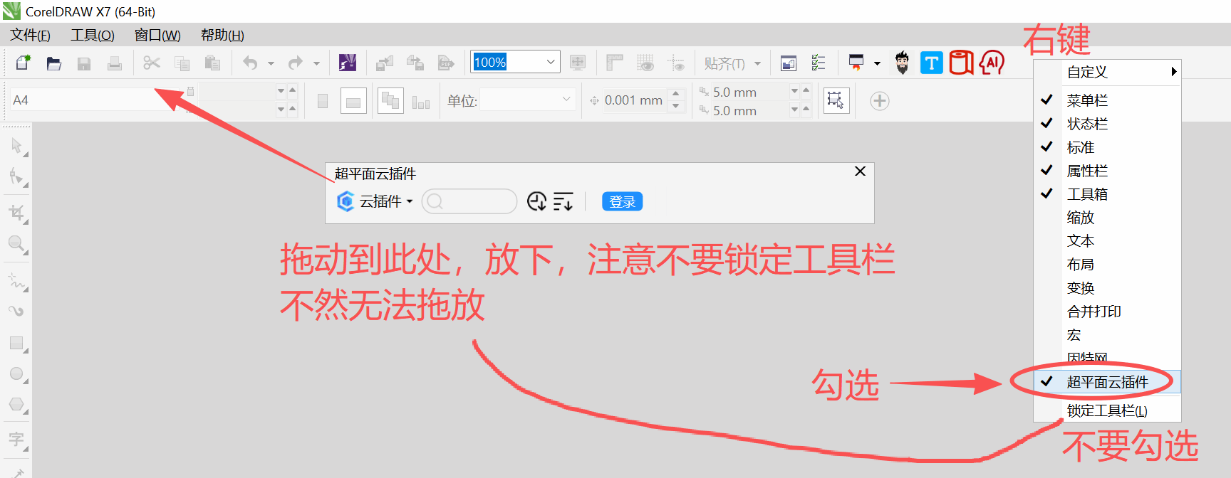 首先参考此步骤 安装云插件,完成后,按照以下方式启动CDR软件并设置云插件工具栏。